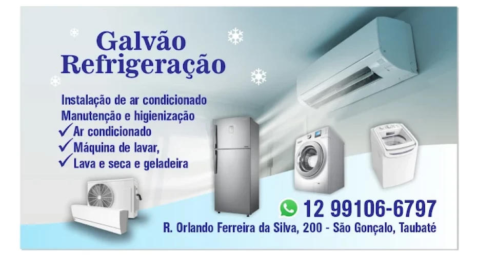 RefrigeraçãoRefrigeração em Taubaté. Conserto e venda de geladeira, máquina de lavar, micro-ondas e instalação e manutenção de ar condicionado. Atendimento a domicílio com honestidade, qualidade e agilidade. Fale com a Galvao Refrigeração.